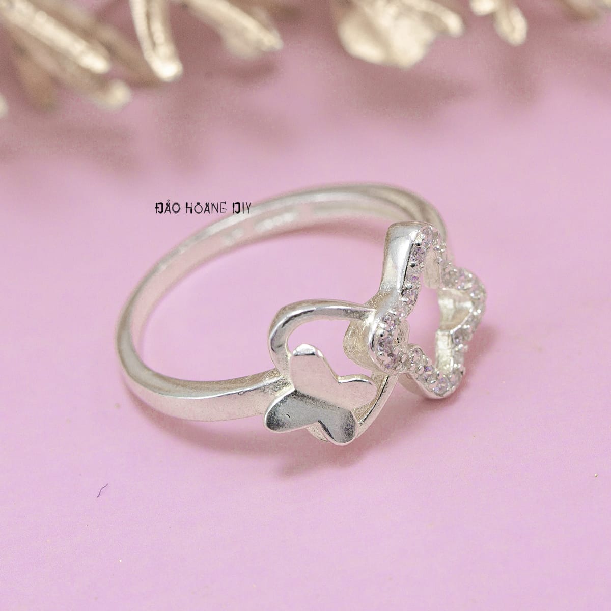 Thiết kế của mặt nhẫn hình thiết kế bông hoa và trái tim cách điệu đính đá mang phong cách trẻ trung, nữ tính